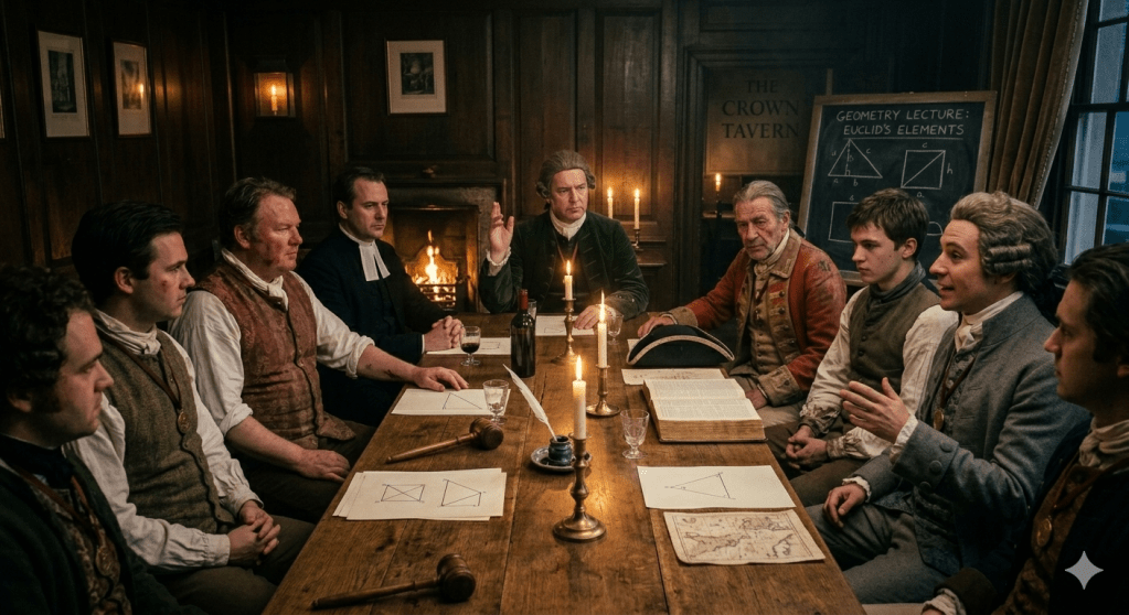 Imagina una taberna en Europa, alrededor de 1735; un grupo de hombres se reúne en torno a una mesa larga. Entre ellos se sientan un comerciante de vinos, un clérigo, un oficial del ejército retirado, un aprendiz de imprenta y un filósofo. Se dirigen unos a otros como «Hermano».