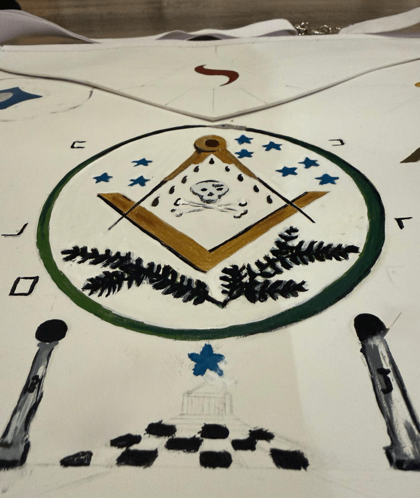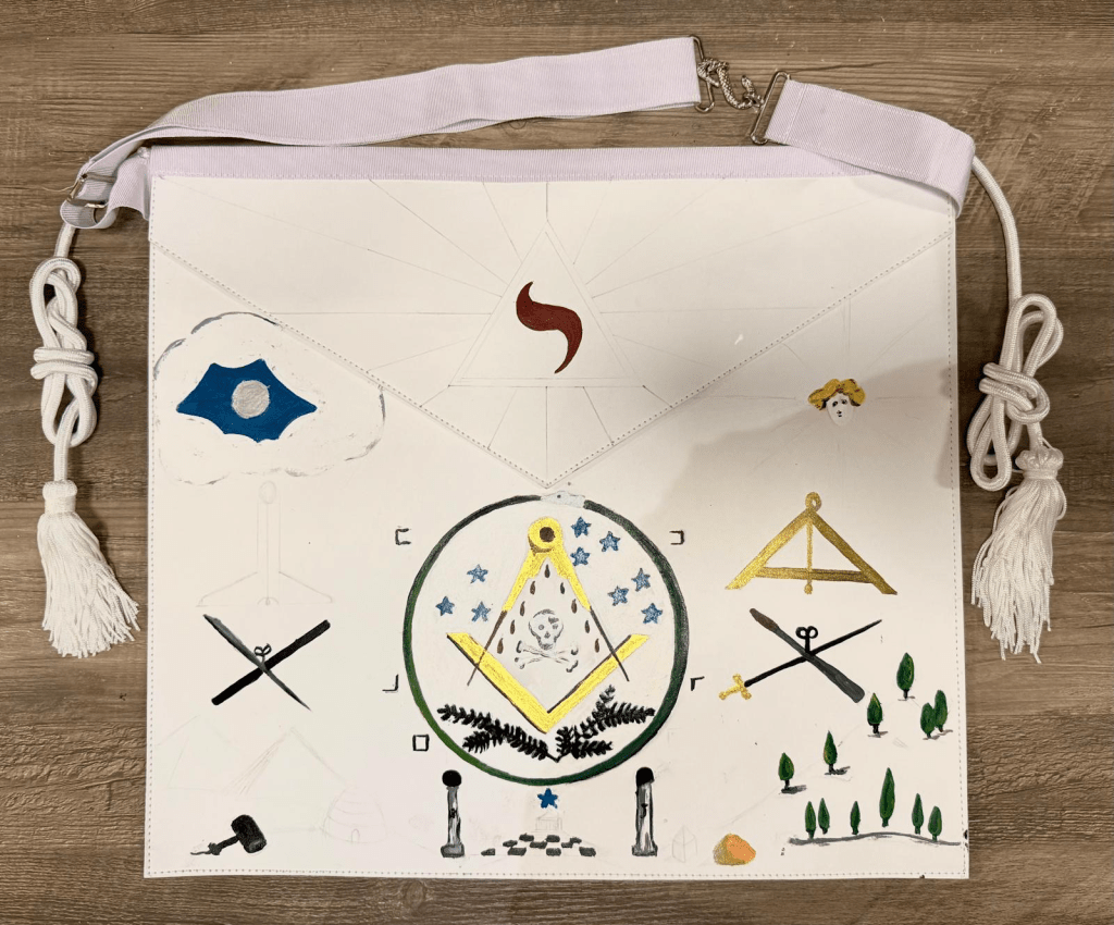 This apron emulates the classic 18th-century «Royal Art» design, featuring working tools and profound symbolism. (Estimated market value: $250 – $400 USD)