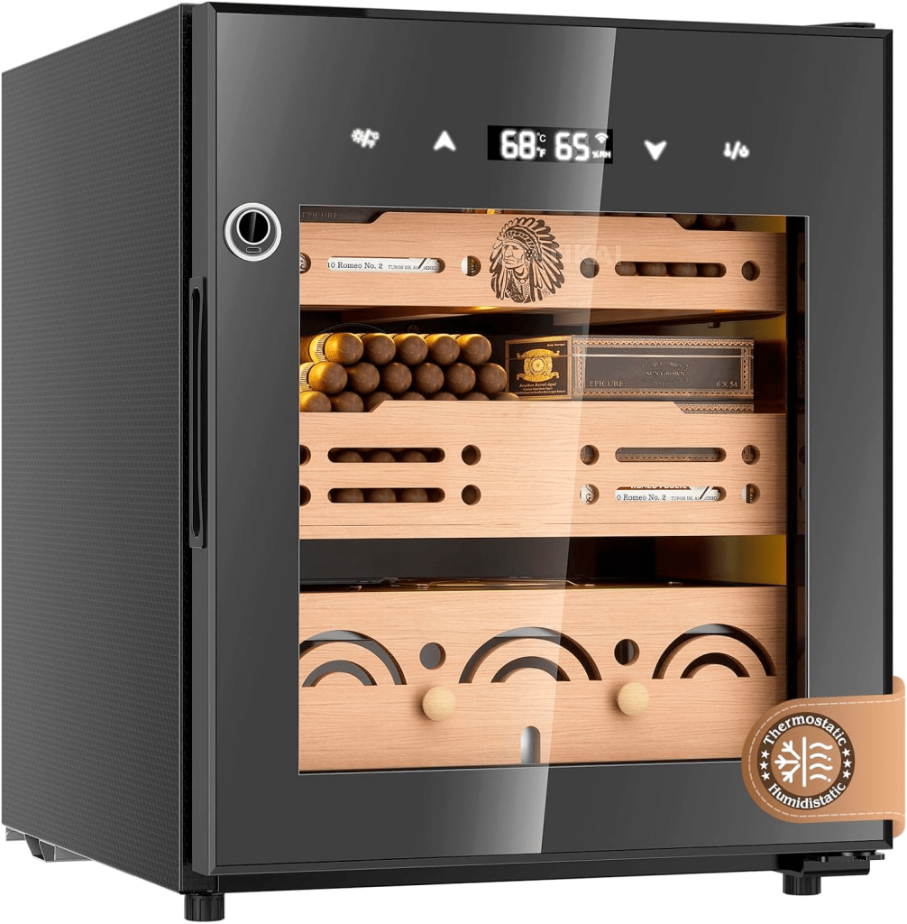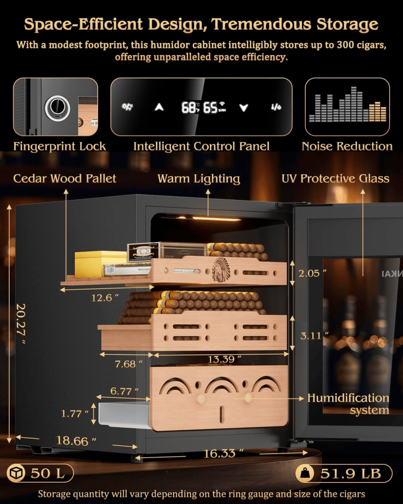 Electric Cigar Humidor Cabinet with Temperature & Humidity Control System, 50L Cooling Cigar Fridge up to 300 Counts, Cedar Wood Shelves,Digital LED Screen, Fingerprint Safety Lock (Estimated market value $270 – $300 USD)