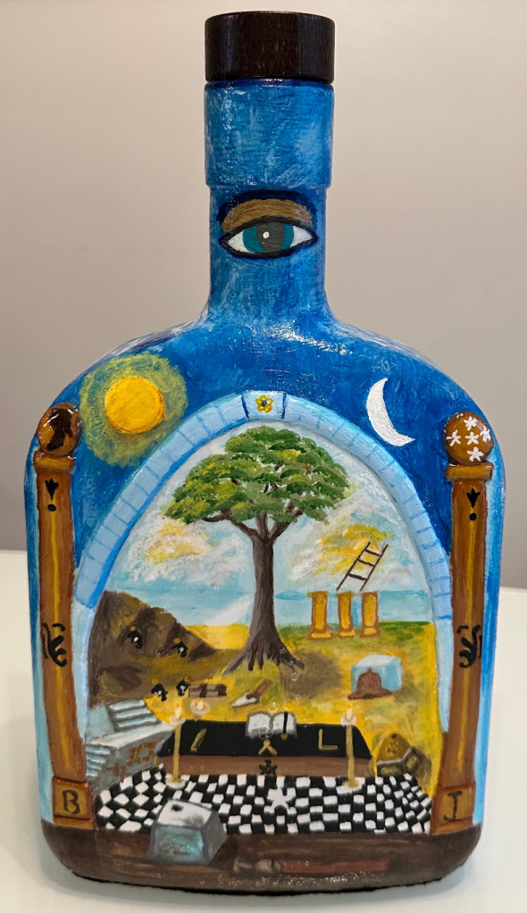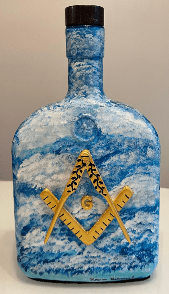 A distinctive collectible piece featuring a premium bottle of Woodford Reserve Kentucky Bourbon Whiskey, meticulously hand-painted with beautiful Masonic Symbolism. This one-of-a-kind artistic creation is executed by Lady Rosana Betancourt, of our Libertad Ladies (Estimated market value $250 USD)
